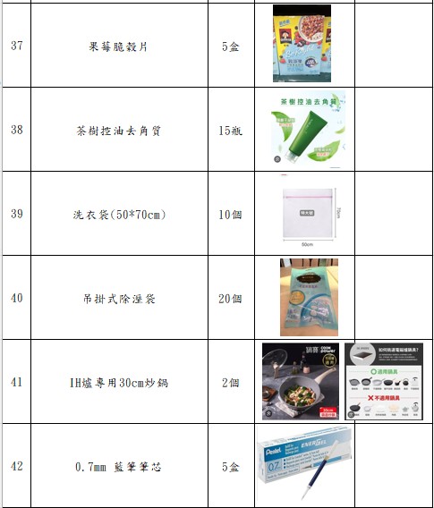 | 編號 | 品項 | 數量 | 單價 | 實物照片 | 認捐單位 |